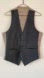 Grey with white and blue pinstripes. Five buttons. Two front pockets.