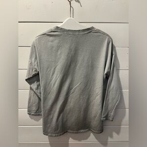 Chandail doux gris clair à coupe ample, manches longues, avec encolure en V. Poche poitrine discrète, fini légèrement brillant. Fabriqué en Italie. Mélange de coton et viscose. Aucune marque visible. Taille unique – veuillez vous fier aux mesures. État comme neuf.
