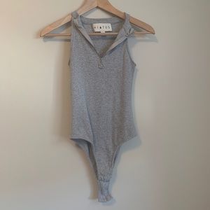 Adorable ribbed bodysuit with circle zipper detail is just like new! Material is thick and stretchy making it very comfortable. It has a cheeky cut bottom with a 3 snap closure. Only worn once. 💕