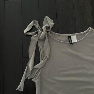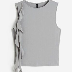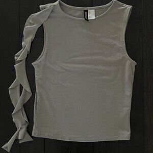 H&M ruffle top, grey sleeveless tank, shoulder ruffle blouse, subversive basics, asymmetrical top, grey boat neck tank, aesthetic grey top.