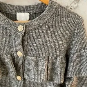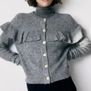 Soft, rib-knit cardigan. Round neckline, gold tone metal buttons at front, and ruffle-trimmed detail at top extending over sleeves. Long sleeves.