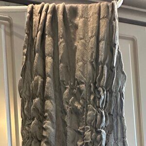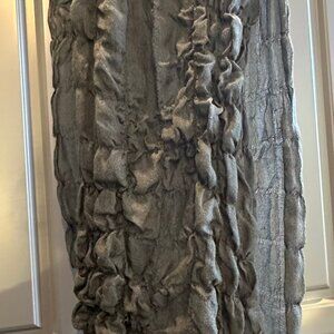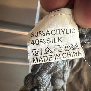 Grey Ruffled Scarf, brand name unknown. Condition is good but has been worn. Material is 60% Acrylic and 40% Silk.
