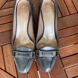 Salvatore Ferragamo. Grey dress shoe size 7 1/2. Heel is 2 1/2 inches. Shoes show wear, Shown in pictures. Worn to work, retiring now. Great to pair with dress pants or skirts for the office.