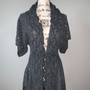This knit cardigan is truly a dream. The sequins shine subtly as one moves, and the softness of the fabric is perfectly comfortable! Can be worn tied or opened.