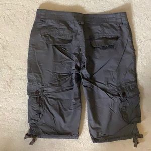 Brand new, without tags grey shorts; zipper & button closure; belt loops; size 8 & 12” in length; side pockets, cargo pockets with buttons, back pockets with flaps; loose fitting