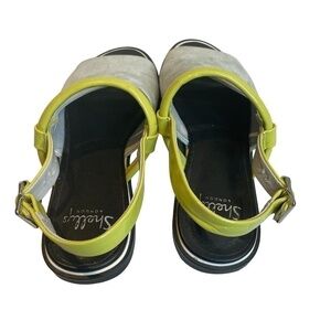 These shoes were worn once to an event, in very good condition. The grey sued app is in excellent like new condition as well as the sole. The lime green strap has a small mark see last photo, very comfortable and makes a statement!