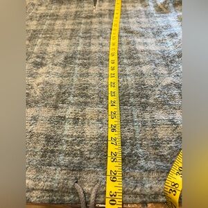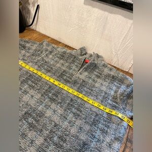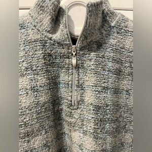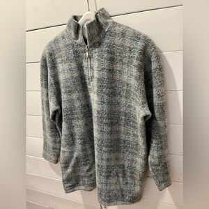 Cozy half-zip sweater in a soft grey textured knit with subtle plaid pattern. Features a stand collar, long sleeves, side pockets, and adjustable drawstring hem. Made from a warm and comfortable blend of acrylic, polyester and other fibers. Perfect for layering on chilly days.