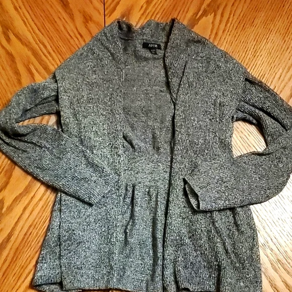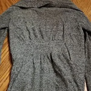 Really cute grey cardigan. Has an elasticized band in the back that makes it super flattering. I have an insanely long torso (5'9 but with short legs) and it's just too short on me. It's in really good condition. I didn't realize it was a petite when I bought it.