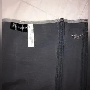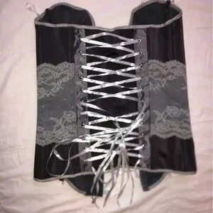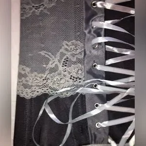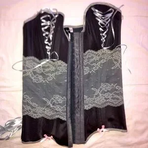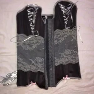 Grey corset with lighter grey lace and ribbon. Baby pink bows at bottom front. Double eye and hook closures in front to adjust for size