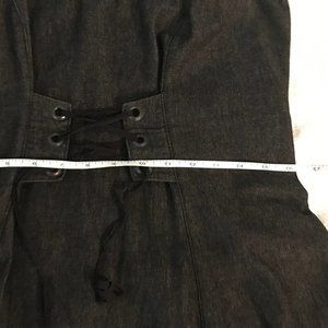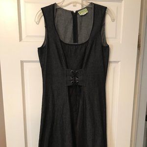Charcoal grey with lighter grey piping. Cotton twill, like a lightweight denim. Empire waist with a corset-like cinch under the bust. Loved this dress so much and wish it still fit me well. Alas, my gain is your gain.