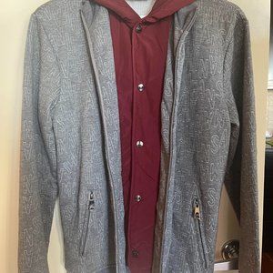 Soft cotton grey AJ hoodie with AJ insignia all over with deep red nylon liner and hoodie