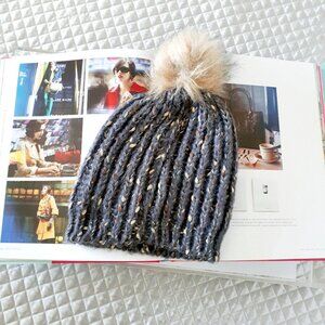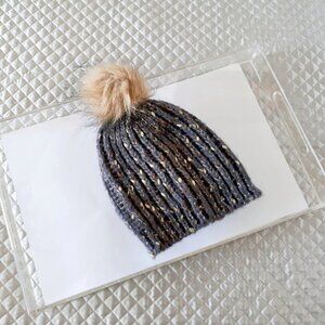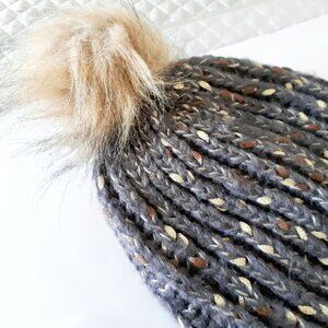 Grey and metallic thread knit beanie hat with faux fur pom pom topper