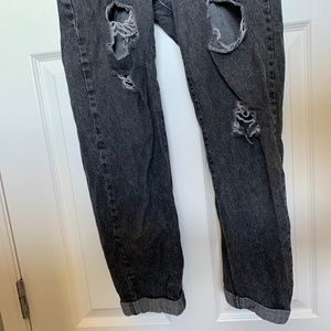 Is size medium but fits small, the zipper is replaced so it’s brand new. One belt loop is ripped but an easy/cheap fix, these jeans sit at ankle length. Polyester and denim combo for return to shape after wash