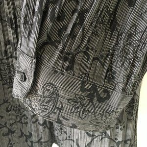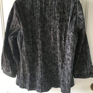 Dressy grey blouse with black scroll features, 3/4 length sleeves