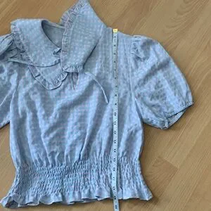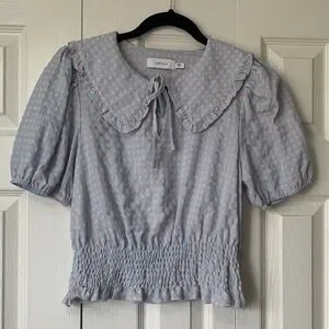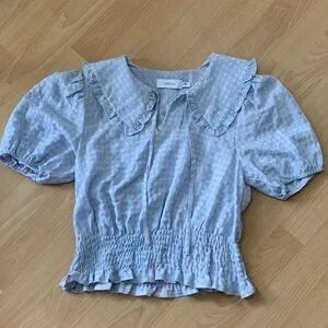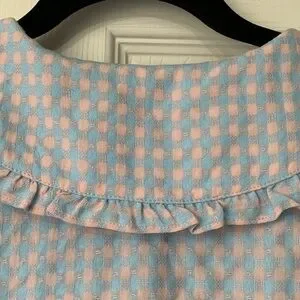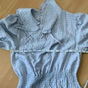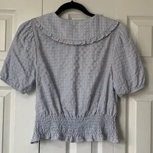 Sweet and stylish. Its defining detail is the Peter Pan collar, which adds a touch of vintage-inspired whimsy. Smocked waist, short puff sleeves. Length 19 inches, pit to pit 16 inches. In very good condition. From smoke free home.