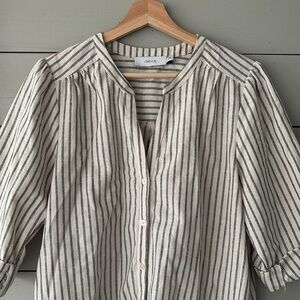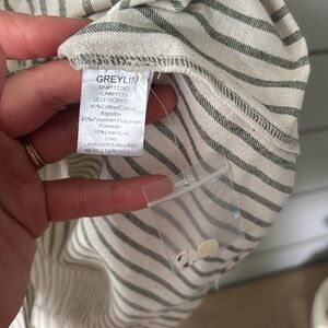 Chic and effortless, this Greylin dress features classic vertical stripes in a neutral palette, made from a lightweight, breathable linen-cotton blend. It has a relaxed silhouette, ¾-length rolled sleeves, and a subtle gathered back yoke for added movement. Full button front and convenient side pockets make it as functional as it is stylish. Comes with original extra button attached.
