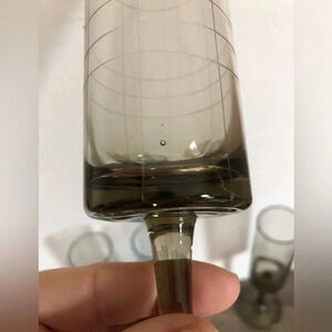Stunning glasses, specifically designed for champagne but you could use these for anything! They would look adorable with a little fruit parfait or no bake cheesecake served in them. Excellent condition, no chips or cracks. Lot of four glasses, three are smokey glass and one is a teal colour. Based on research I believe these were made by Mikasa and the pattern name is “grid” or “park avenue grid”.