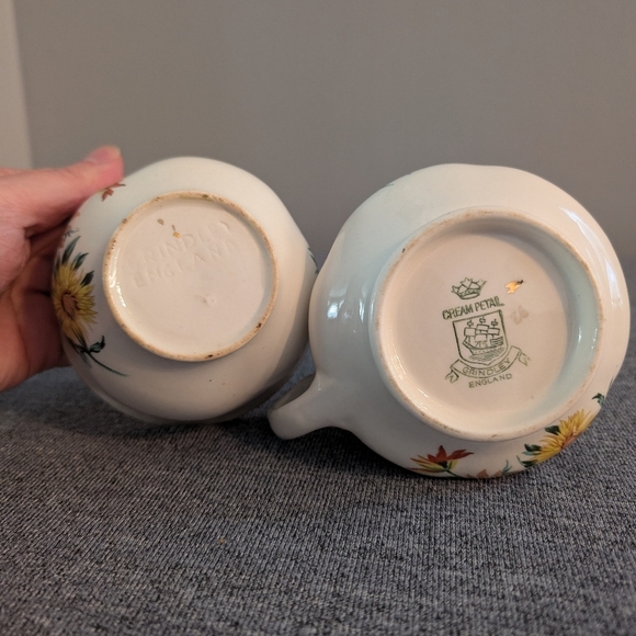 Grindley "Cream Petal" Creamer and Sugar Bowl Set, Floral. In very good used condition, only flaws noted are very light crazing on the exterior of the sugar bowl and some wear of the gold trim on both (see photos). No damage noted otherwise.