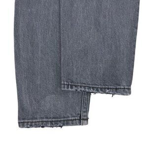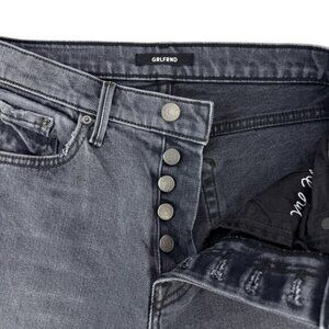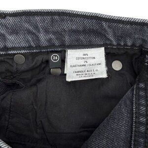 98% cotton, 2% elastan. Made in USA. Machine wash. Button fly. 5 pocket styling. Whiskering on front along pockets. Destroyed fabric detail.