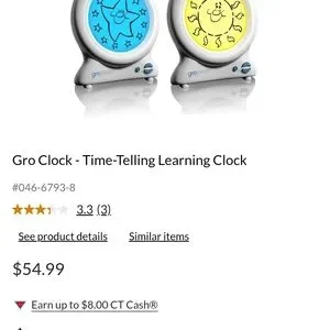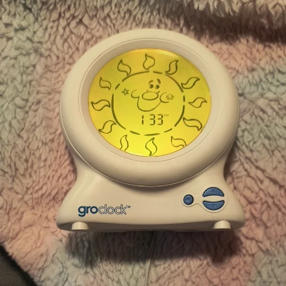 Groclock sleep trainer clock with a cheerful sun design. Features a bright yellow display.