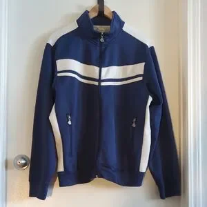 Stay stylish and comfortable with this men's blue and white track jacket. Perfect for casual outings or athletic activities.