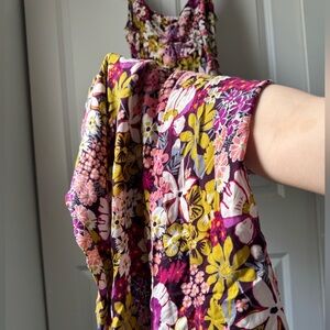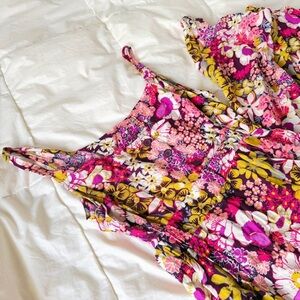 Step into sunshine with this vibrant vintage Forever 21 maxi dress! Bursting with a bold and beautiful floral print in shades of pink, yellow, and purple. Perfect for those carefree days and warm evenings. Embrace your inner flower child with this fun and flowy piece