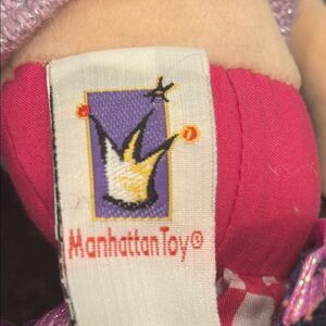 Groovy Doll-Manhattan Toys- Green and Purple Doll with Cheerful Expression . Size 14”. 2000. This delightful doll features a vibrant purple outfit accented with white, paired with charming green shoes. Its textured black hair adds a playful touch, styled in a fluffy manner. The doll's cheerful expression makes it perfect for imaginative play and display. A wonderful addition to any doll collection, it promises endless fun and companionship.