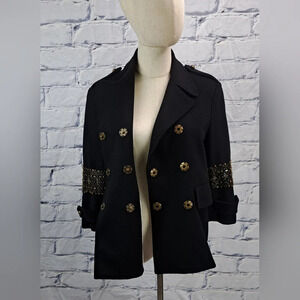 Wool Nylon Cashmere Blend Metal Beads Pea Coat Winter Jacket Military Epaulettes Double Breasted Black Excellent Condition. Barely Used. Very Well Cared For Nice and Clean. Inside and Out. No Rips, Stains, Holes. No Odor. Smoke and Pet Free Environment. Please check last picture for measurements