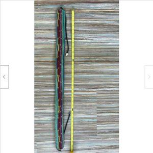 Tie-on belt has entirely beaded design with seashell "flower" pattern, lined with colorful woven fabric. Note that two of the seashells are broken, as shown in the second & third photos. Belt is 33" long with 11 1/2" black cord ties at each end, 2" wide. Looks great worn with dresses & over blouses.