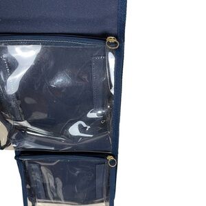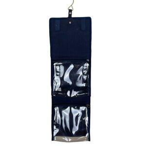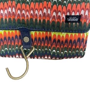 Hanging toiletry bag with plastic pouches that velcro to the hanging part. The zippers work well. Some wear on the pouches themselves, but no holes. Some wear on the hook, but still looks good. Pattern and colours representative of the Kate Spade brand, eccentric and colourful.