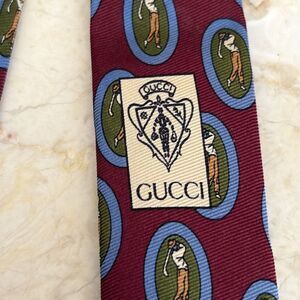 In excellent preowned condition authentic Gucci 100% silk tie featuring an all over print of golfers. At first impression it looks like a classic power tie, with a deep burgundy base and an all over oval printed pattern, but when you get closer you see the golfers within each oval, super cool! And the perfect gift for the golf aficionado.