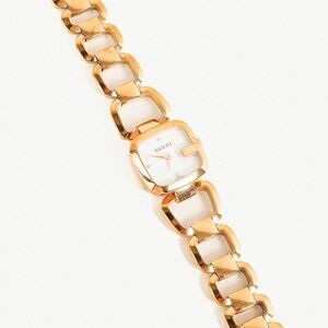 This watch from Gucci is crafted in a gold-tone stainless steel, and features a mother of pearl dial, 3 diamonds, a rounded rectangular "G" case, a chain bangle bracelet, and a jewelry clasp closure.