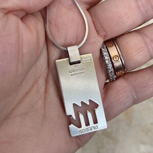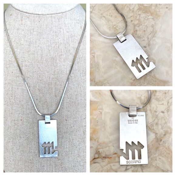 Gorgeous unisex Gucci piece! Solid 925 sterling silver “Scorpio” zodiac sign Gucci pendant. Hangs from a sterling silver fancy square chain that is 18” long.