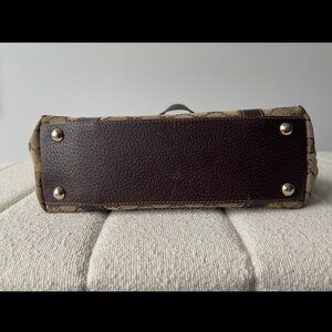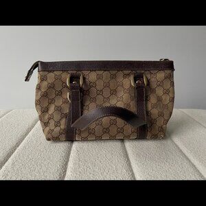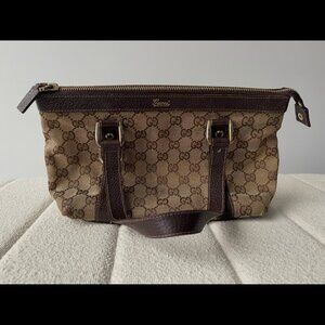 Authentic vintage Abbey tote featuring the classic brown and beige Gucci monogram pattern along with brown leather straps and bottom, gold-colored hardware and dark brown cloth interior. Condition is good as there are signs of corner wear, discoloration on hardware and minor scratches and loose threading on leather parts. Please see pictures for details. Protective pouch included (shown in first picture).