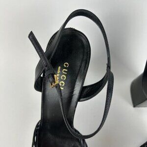 Black leather Gucci platform sandals with knot accent at vamps, covered heels and buckle closure at ankle straps.