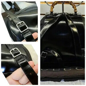 -black cloth with patent leather closes with a belt buckle and a leather drawstring lace