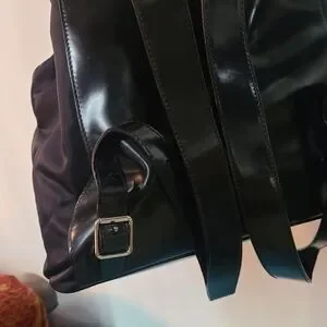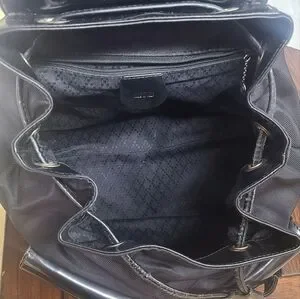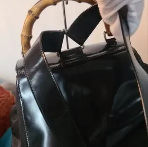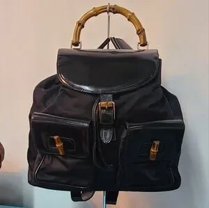 back straps a bamboo top handle a top flap, a drawstring closure and interior slip pocket