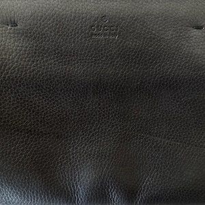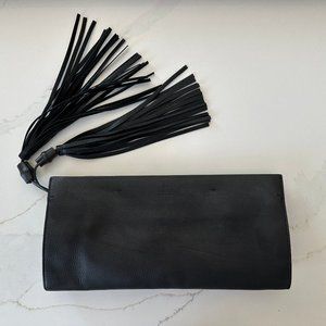 Authentic Gucci flat clutch bag featuring black lacquered bamboo details, fringes, polished rose gold hardware and a double tassel. It closes with two hidden magnets. Lining is made of creamy pink lamb leather, the outside is black textured leather, very soft to the touch. Has a natural crease at the bottom, see a picture attached. Comes with a dustbag.