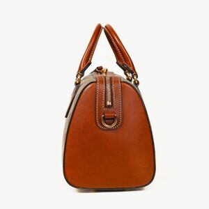Composition: Coated canvas, leather trim, textile lining, metal hardware.