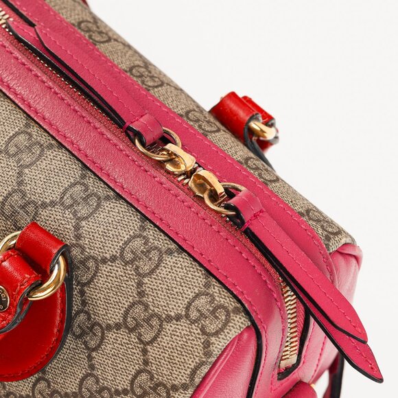 Made in Italy, this small boston bag from Gucci is crafted with the designer's GG Supreme canvas in Beige and Ebony, and features leather detail in hibiscus and pink, gold-tone hardware, double hand-stitched handles with a padded base, a detachable and adjustable shoulder strap, and five metal feet. Fixed with double pulls, the top zip closure opens to a camel microfiber-lined interior containing two slip pockets, and a zip pocket.