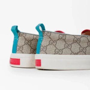 From Gucci, these classic slip-on sneakers are crafted from the signature Gucci GG canvas in beige and feature a rounded toe, patent leather trims in red and blue, a blue grosgrain pull tab, nude leather insoles and lining, and a white rubber outsole.