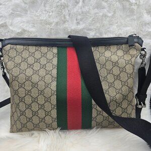 This crossbody bag features a coated canvas body with leather trim and web detail trim with an adjustable flat strap for comfortable wear.