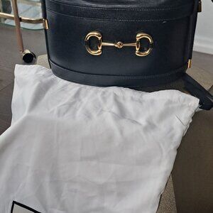 Absolutely mint condition Gucci Black Beige Calfskin Horsebit 1955 Drawstring Bucket Bag with dust cover and authentication certificate. Interior is spotless. Like new condition. Elegant, luxurious Gucci vintage ✨️