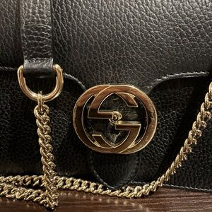 Gucci Black Icon GG Interlocking Small Crossbody Bag with gold chain strap. Serial number is H026299387. Excellent condition - barely used.