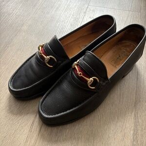 Elegant black leather loafers. Features red and gold detailing. Classic Gucci style.
