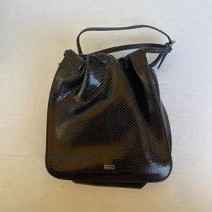 This simple and elegant black python leather 90s Gucci mini bag is the perfect mini bag for a night out or event. Drawstring handle drop bag.