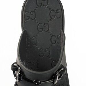 Made in Italy, these thong sandals from Gucci's Gucci Lido collection are crafted in a Black Rubber, and feature flat block heels, open rounded toes, enameled horsebits, and GG rubber insoles.