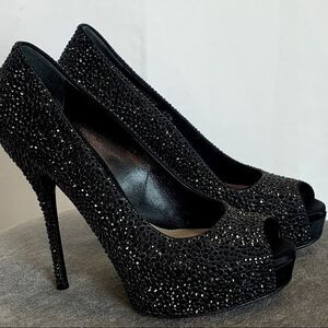 GUCCI Black Satin Strass Embroidered Sofia Etoile Peep Toe Pumps Size 37.5 🔥
