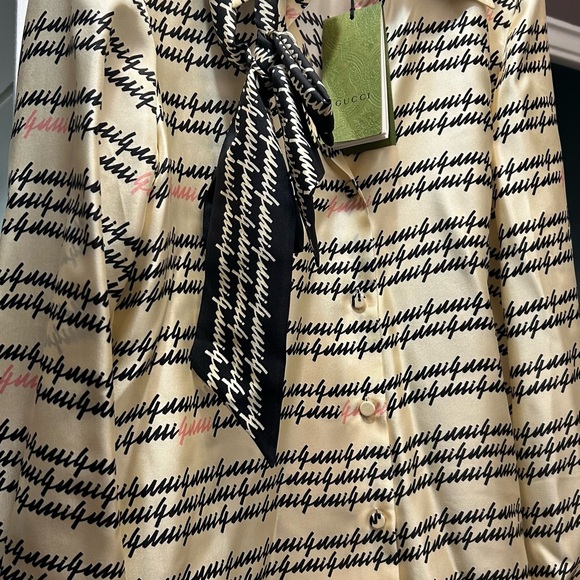 Elegant Gucci blouse with a bold script pattern. Features black and cream hues. Perfect for a stylish look.