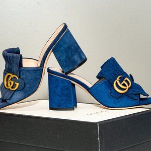 Gucci Kid Scamosciato mules in the color Blue Ink. Comfortable and easy to wear. You will not be disappointed! Comes with box, and dust bag for each shoe.